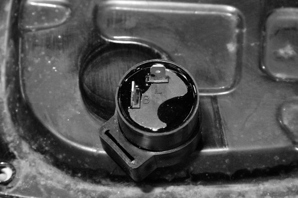モノクロでわかりにくいのですが、黄(左)と白(右)のギボシをメインハーネスから抜きます。固くて抜けにくい場合はラジオペンチを使うとGOODですよ