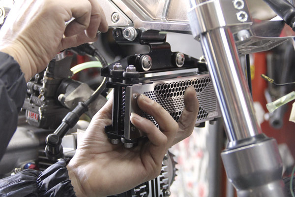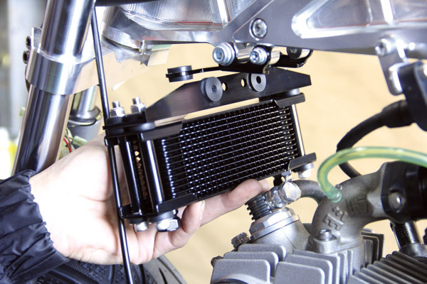 ストーンガードを装着した時に、サイドからチラッと見えるブラックのオイルクーラーがたまりません。ビレットのヘッドカバー類との愛称も抜群!!