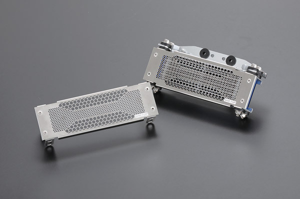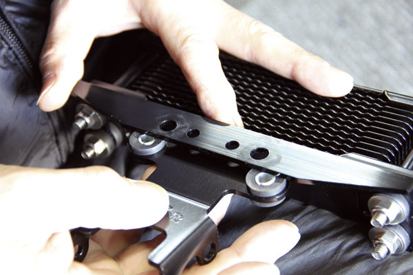 オイルクーラーのコアを飛び石などから守ってくれるストーンガードも装着。ヘッドライトやエンジンのヘッド下に装着を予定している方は同時購入がオススメ