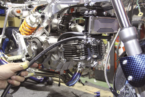 デイトナ製のオイルクーラーから自然にアールを描くようにライン取りしてみました。鈴木さん曰く昔のZ風な取り回しということでした。一気にメカニカルな見た目に