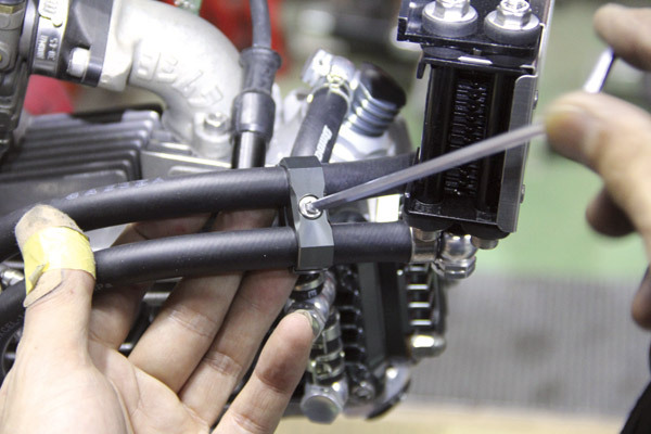 ホースがバタつくのもイヤだし、見た目にもカッコ良く出来るということでホースセパレーターも用意。ヘッドカバー類と合わせてガンメタをチョイス
