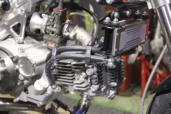 ビレットのヘッドカバー類、オイルクーラーでエンジン周りが一気にゴージャスな見た目に!! オイルラインは最近の定番となりつつあるゴムホースにしました