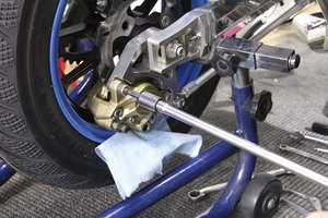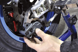 ブレーキローターを留めるボルトを2本だけ外し、ローターをズラしながら取り付けていきます。フロントと同じようにリアも交換。ホイールに傷は付けてませんよ~
