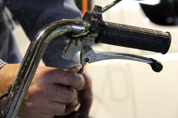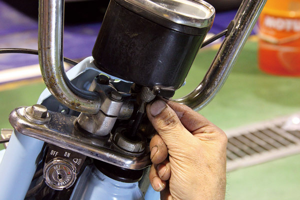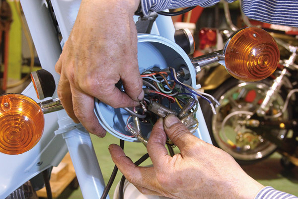 前回で足周りの組み込みが完了。今回は残りの部分を組み込んでいきます。まずはハンドル周り。メーターを取り付けたら、メーターケーブルを繋ぎます。ヘッドライトケース内に予め通してあったハーネスを色を間違えないように繋ぎ、ブレーキワイヤーをブレーキレバーに付けました