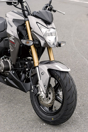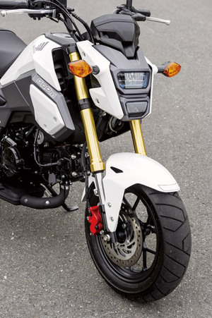 どちらもゴールドのアウターを採用した倒立フォークを装備。インナーチューブの太さはGROMがΦ31、ZがΦ30となっている。若干の差だが、これがバネ下重量の軽減に繋がる可能性も