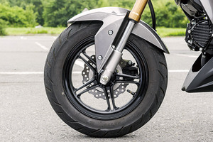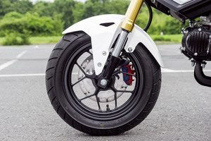 ホイールはどちらも12インチのチューブレス仕様。ZのホイールデザインはKSRと同じだが、ブレーキローターが左から右になっている。GROMはハブのデザインが変更された