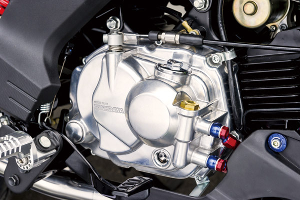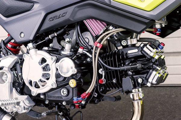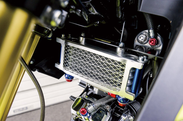 ボアアップしたエンジンに合わせコンパクトクールキット(¥26,000/税抜)を装備。右奥に見えるオイルキャッチタンクは開発中とのこと