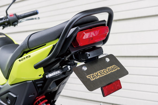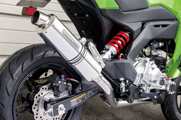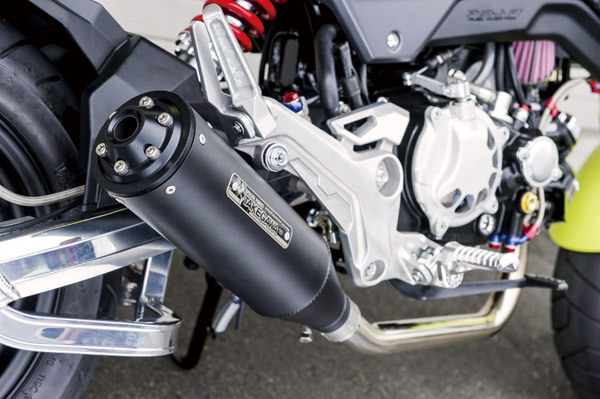 老舗と言われるパーツメーカーだけあり、GROMはイチ早く外装からエンジン、吸排気まで作り上げ、そのスピードは圧巻。気になるカスタム内容は、エンジンにはボアアップキットにビッグスロットルボディを投入しフルチューン済み。マフラーは純正と同じくダウンタイプながら、ブラックのサイレンサーがポイントのトラッカーマフラーが取り付けられる。さらにスイングアームやリアショックも変更してあるが、旧型用にリリースしたものが使えたとのこと。他にはない形状のグラブバーやバイザーも装着と、外装にも抜かりはない。