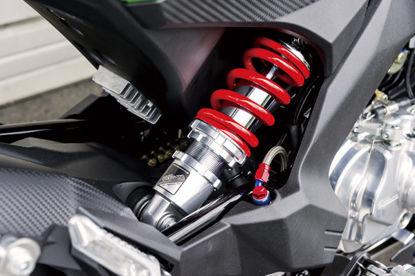基本的にエンジンパーツに変更はないとのことで、スーパーヘッド4V+Rボアアップキット(¥128,000/税抜)を装着。ビッグスロットルボディーキット(¥33,800税抜)も装着済み
