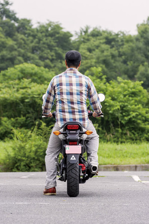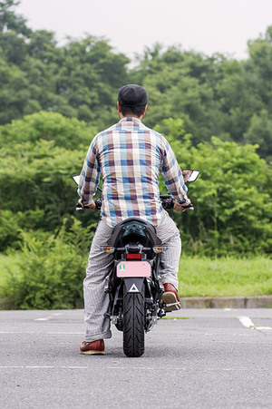で、ステップから足をおろしても両足の踵が地面につく。しかし注目して欲しいのは膝の曲がり方。GROMよりもZの方がステップ位置が高た