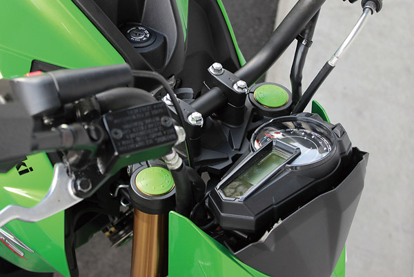 フォークのトップ部分を彩る、グリーンのフロントフォークキャップ(¥1400/税抜)。純正品と交換するだけでドレスアップ出来る