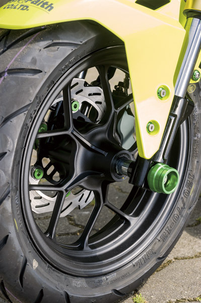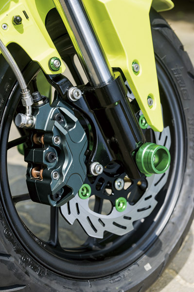 フロントブレーキには、他の4ミニでも高い人気を誇るシフトアップ製ビレットキャリパーとローターを合わせた。外装とグリーンアルマイトの組み合わせが◎