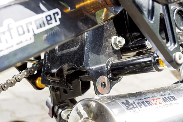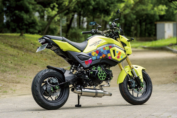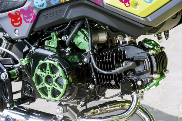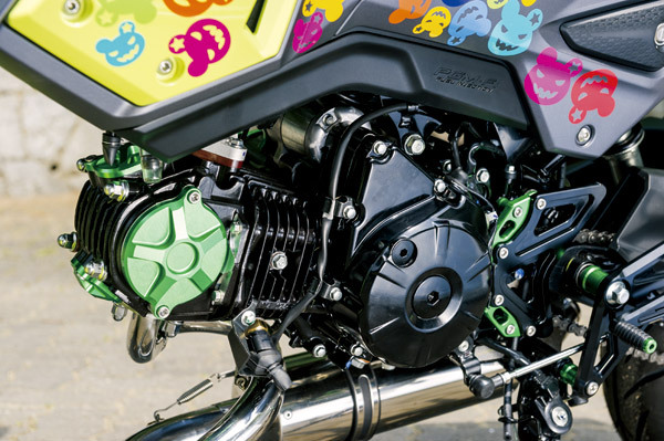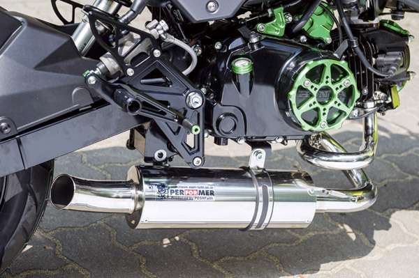 PF‐2 GROMダウンマフラー(¥43,000/税抜)はエンジン下でエキパイが一周し、管長を稼いでパワーアップが図られ、リア周りがよりシャープな見た目に