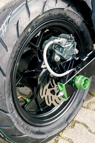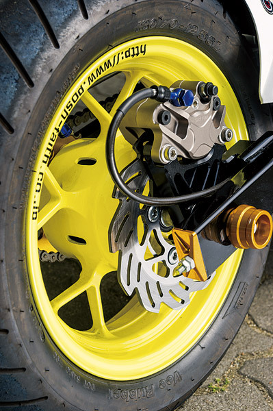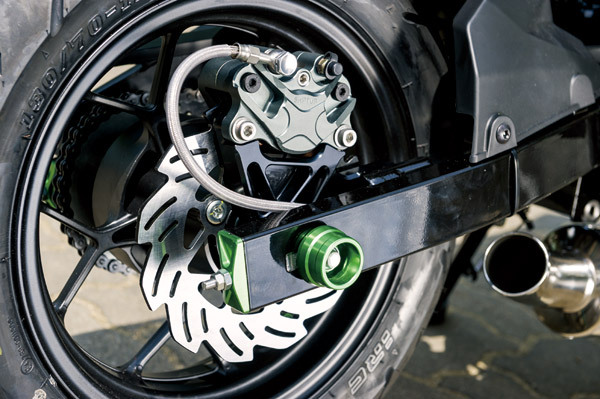 リアもフロント同様、シフトアップ製キャリパーとブレーキローターを装着。このウェーブ形状が、ブレーキング時の熱を素早く放熱し、ブレーキの効きを保つのだ