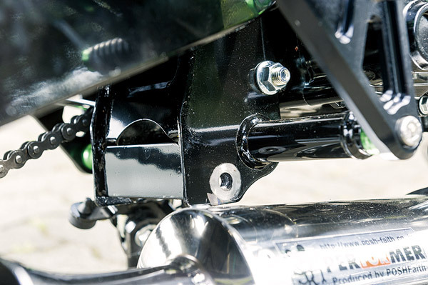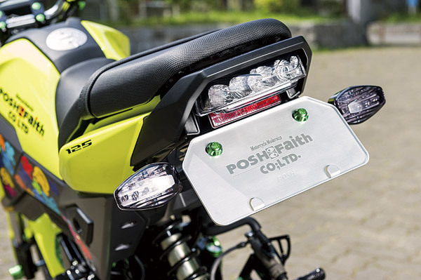 GROMは序盤で紹介したように外装がガラリと変わり、シート下の燃料ポンプやバンクセンサーの位置も変更になっている。特にバンクセンサーは、テールランプ付近にあるのだが外に張り出すように設置されている。そのため従来のフェンダーレスキットが使用することができず同社では、新たなキットを開発(写真は試作品を装着)しているという。