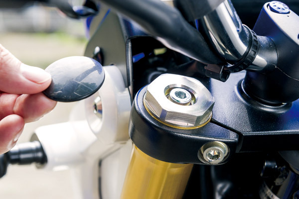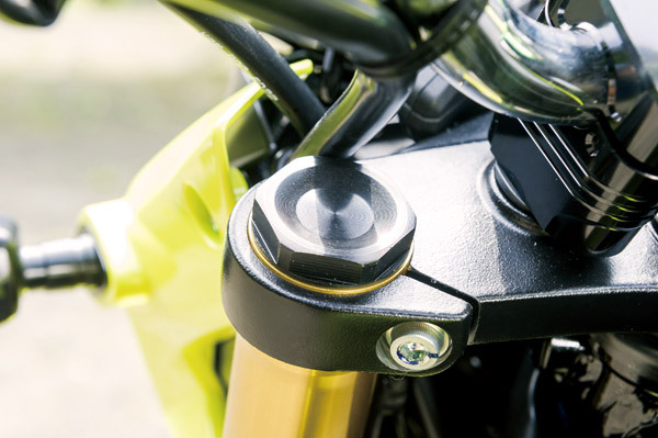 フロントフォークのトップ部分は、旧型のみ取り外せる蓋がついていたが、新型は一体式となった。インナーは変更が無いようだ