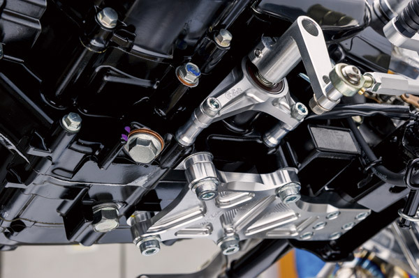 シフトチェンジのしなりを軽減するシフトガイド(¥8500/税抜)とエンジン補強プレート(¥16800/税抜)を装着。目立つパーツではないが、効果は必ず体感出来るアイテム