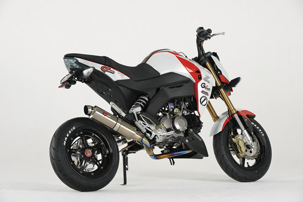 今号の表紙を飾ったZ 1 2 5PROもGクラフトによって製作されたマシンだが、もちろんNEWGROM用カスタムパーツも開発済み。4ミニ界でナンバーワンの人気と装着率を誇るトリプルスクエアを使用したスイングアームをはじめ、前後ブレーキキャリパー、バックステップを装着。現在リリースされるGROM用パーツで究極の一品と言えるGC -021アルミフレームが装着出来るかはまだ未確認。新型は外装の変更に合わせタンク形状、フレームの細部が変更されいるようなのでどうだろうか? 今後はフレームをはじめ旧型用に開発したパーツの取り付け確認、新たなパーツ開発を予定。