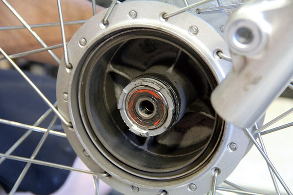 アクスルシャフトを抜けばホイールを着脱できる。今回はチューブも新品に交換。組み付けの際にはドラムの合わせをきちんとする