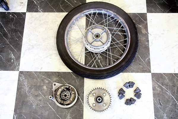 チェーンなどがあるためホイールの ズは2.75-17着脱には手間がかかる。リムバンドが痛んでいたので交換し、ホイールバランスもきっちり取った