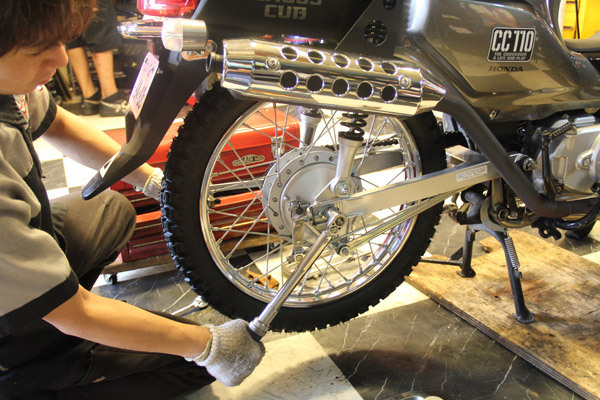 クロスカブともどもタイヤを持ち込んだのは、世田谷にある二輪タイヤ専門店『スピードスター』。タイヤ専門店ということで作業は手早く進行。あっという間に前後ホイールが車体から外された。しかもリムからのタイヤの着脱は機械で行うので実にスピーディだ。