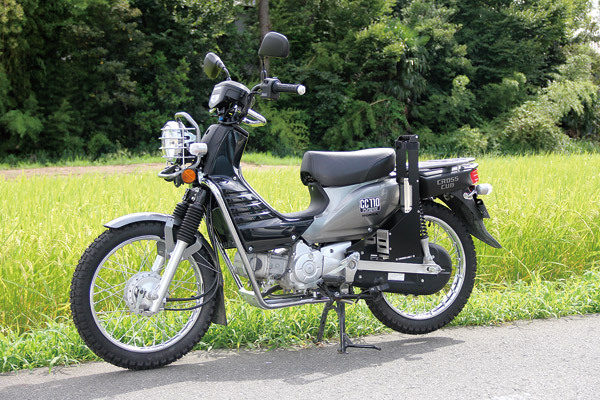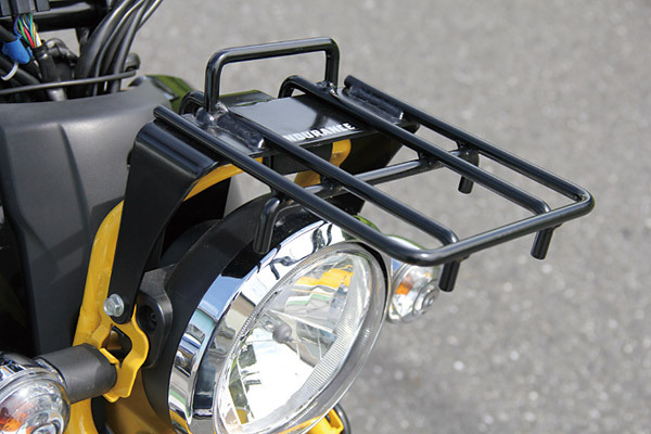 クロスカブのイメージにピッタリのフロントキャリア。レインウエアなどの小物の積載に重宝する。2㎏までOK。6800円(税抜)