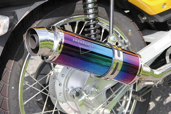新作のグラデーションが美しいType Rマフラー。低音が心地良く、熱による変色を抑える加工を施してあるのが特徴。35,000円(税抜)