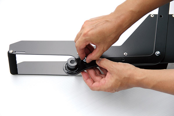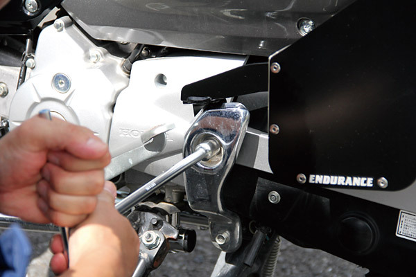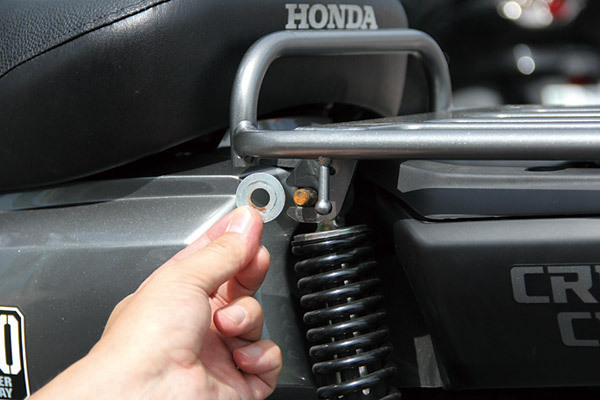 作業効率を上げるため、あらかじめ本体にステーを装着する。車体への取り付けは、リアサス上部のボルトとヒールガードのボルトの2ヶ所。それぞれのナットを外し、ステーをボルトに固定してナットを締めれば完了だ。ただしリアサスのワッシャーは取り除く