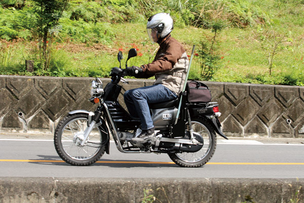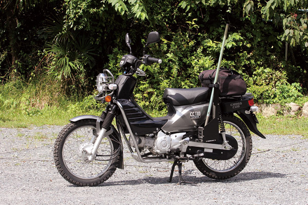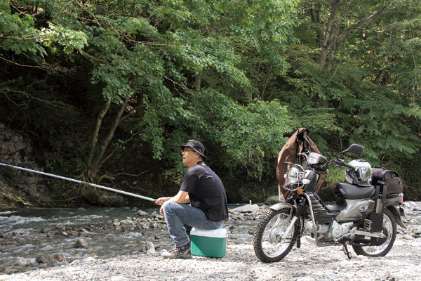 シートバッグを荷台に積載して、ロッドケースに釣り竿を収納したクロスカブは、見事にツーリングフォルムに変身。オフロードタイヤもバッチリ決まっている。今回は舗装路のみの走行だったが、乗り心地は快適だった