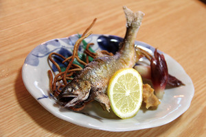 釣果のほうはサッパリだけど、せめてアユは食べたい。釣り竿をしまい、再びクロスカブを走らせて近くの食堂へ。アユの塩焼きを昼飯にしたのである。