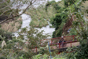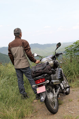 名栗湖をかすめて秩父方面へと抜ける林道を目指す。道は次第に狭くなり、いよいよ深山幽谷の趣だ。林道は全線舗装されているのだが、途中の支線はダートのはず。期待に胸を膨らませて山間へと突き進んでいった。ところが、数キロも走らないうちに通行止めの看板が…。連日の雨でどうやら崖崩れが起こってしまったらしい。しかたなく集落へ引き返し、山に入り込んでいる道を進んでみた。所どころ落石していたがタイトな舗装路がクネクネと続いていた。大型バイクじゃ走りたくない道だが、クロスカブは快調に標高を上げていく。すると視界がパッと開け、山の向こうに都心を遠望。そんな風景にちょっと得した気分だった。