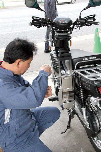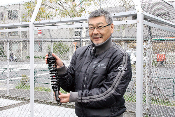 クロスカブ用としてリリースされるYSSハイブリッドリアサスペンションは、比較してみるとノーマルショックよりワイドだ。長さは365㎜と同サイズなので、そのまま取り付けることができる。作業は店長の村田さんにお願いした。