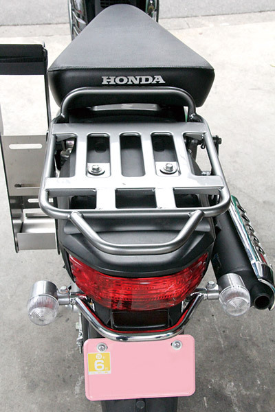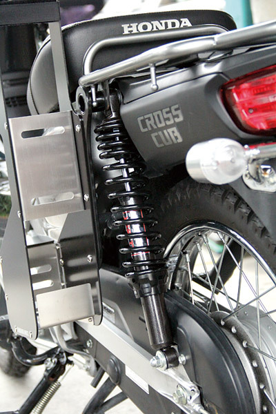 クロスカブ用の強化リアサスがあると聞き、試しに装着してみることにした。さらに積載能力を高める延長リアキャリアも取り付けてみた。これでロングツーリングもバッチリだ!