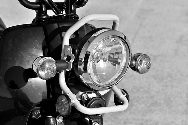 一般的な丸型ヘッドライトを装備するが、ガード風の鋼管製ライトステーによってアウトドアイメージがうまく表現される