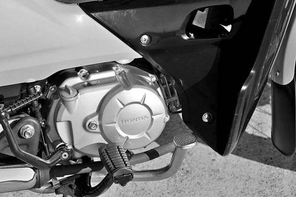 PGM-FI 装備の空冷OHC 単気筒は低中速トルク型で力強い特性。2 段クラッチ採用でショックを軽減した4 速ミッションを備える
