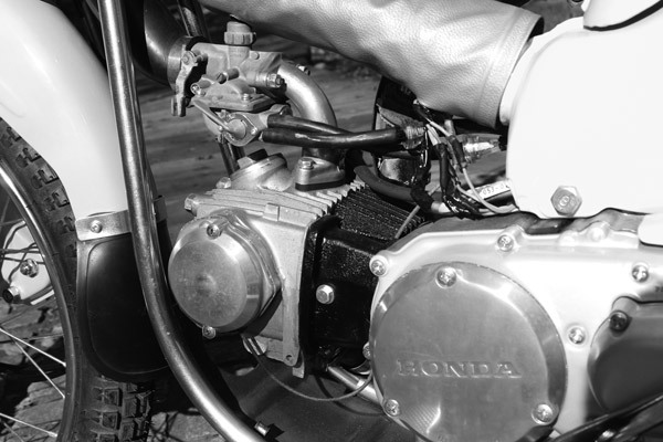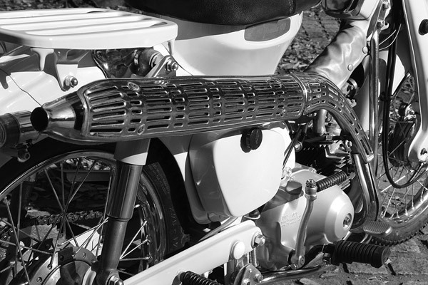 オフロード走行を安心して楽しむには、定番のセミアップマフラーは必須。現在のカブと比較すると、図太いサウンドを発する