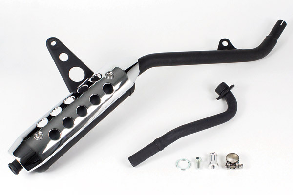 まずどこから手を付けていこうかと思案した結果、カスタムの定番であるマフラー変更から始めることにした。クロスカブ用のマフラーはさまざまなメーカーから販売されている。数あるマフラーの中から「これだ!」という製品を選ぶのは意外と難しい。そこで、アップマフラーに的を絞って選択した結果、SP武川のアップタイプスポーツマフラーに換装することにした。「トレッキングスタイルをイメージしたアップタイプのスポーツマフラーです。アップタイプを採用することで、オフロード走行にも対応します。」と製品紹介されていたのが、カスタムコンセプトにピッタリだったからだ。