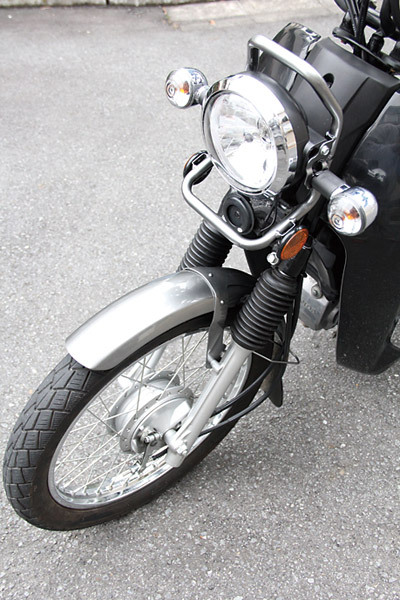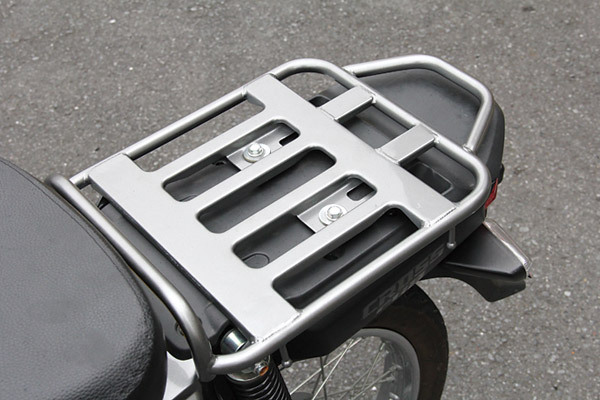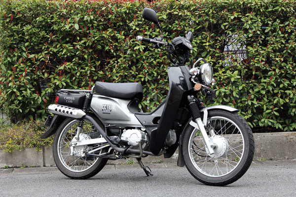 スペシャルパーツ武川ではクロスカブ用のマフラーを数種類生産販売しているが、選んだのはスポーツマフラー(アップタイプ)。もちろん公道走行可能な政府認証マフラーだ。エキゾーストパイプ、サイレンサー共にスチール製で、ブラック塗装されている。さらにクロームメッキのプロテクターが装備してある。