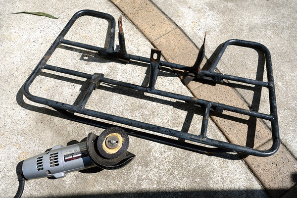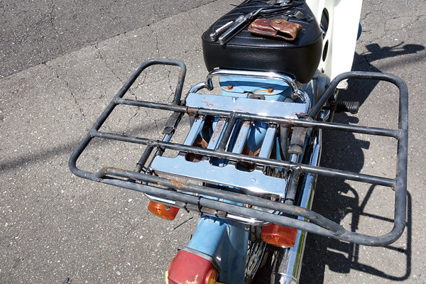当日の朝に荷物がカブのキャリアに積みきれないことが判明したので、急遽適当な部材を使って大型キャリアを付けることに