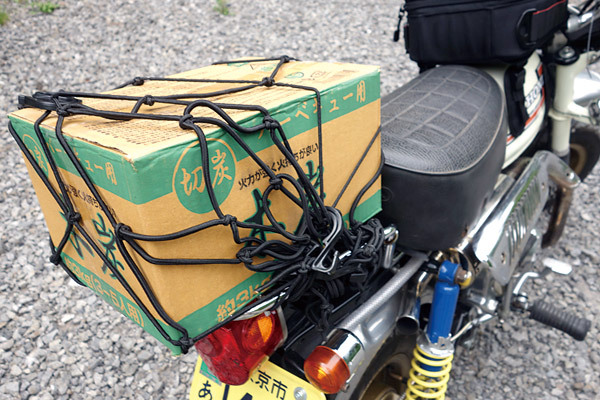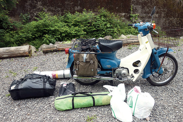 4Lモンキーで来たLUPIN分の荷物(2人用テントやシュラフなど)も搭載しているので、かなりの積載重量になってます。フロントバスケットには途中で買った酒満載! それでもカブ号は元気に走るのでホントに凄い!