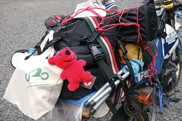 振り分けバッグには工具やカッパなど、あまり取り出さない物を入れてあります