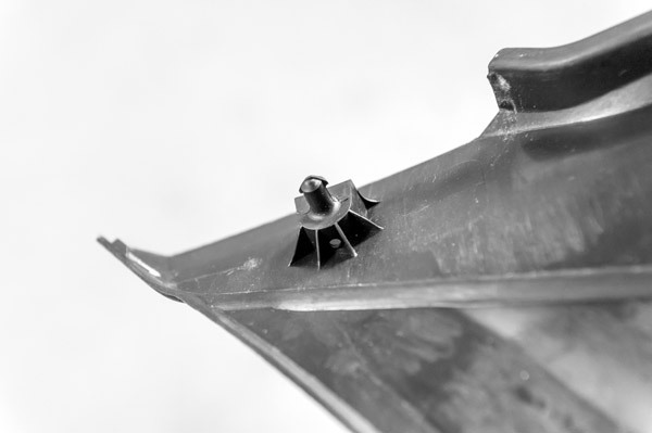 シュラウドの前側に左右1本ずつ、計2本のトリムクリップがありますので、真ん中をプチッと押して抜きます