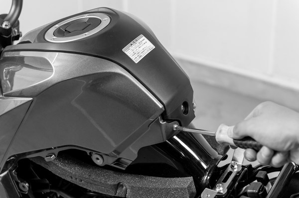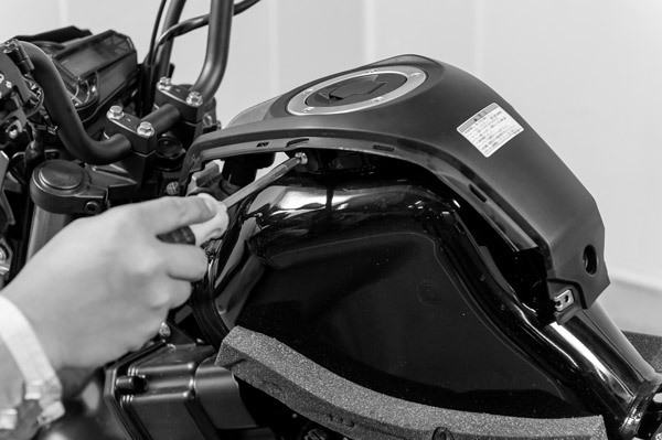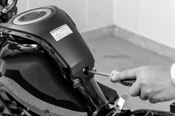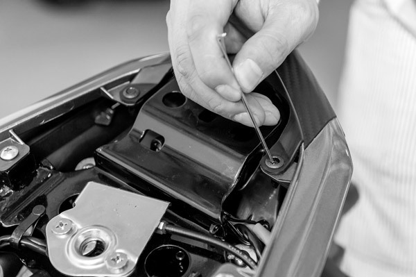 タンク近くに+のネジがありますので、左右計2本を緩めます。シート下は入り組んでいるので、ネジを落とさないように