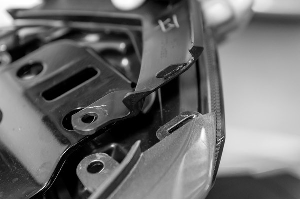 A.GROMにも使われていた2本のトリムクリップで留まっている、テールランプの真上にあるV字の小さなパーツを外します B.トリムクリップを抜いたらV字のパーツを後方に引っ張れば外れます C.パーツの裏面に斜めの爪があるので後方に引くというわけ