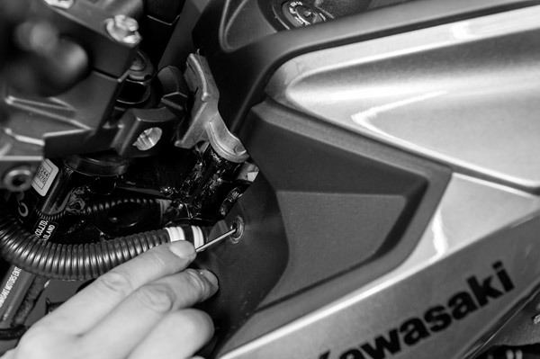 そしてテールカウルを留めている+ネジ4本を緩めます。ドライバーはネジに対してまっすぐ当てて使うのが舐めないコツ